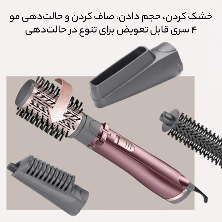 اقلام همراه سشوار: متمرکزکننده پهن , سری شانهدار , سری برسدار گرد باریک , سری برسدار گرد پهن