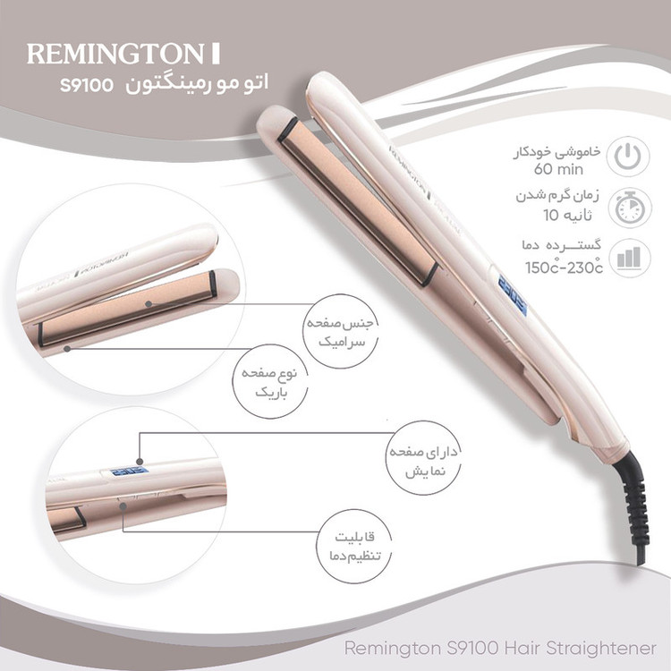 اتو مو حرفهای پرو لوکس رمینگتون مدل S9100 یک محصول پیشرفته مجهز به تکنولوژی گرمادهی هدفمند برای صاف کردن موها است. این صاف کننده قدرتمند، با صفحات سرامیکی کاملا سُر خود، موها را به خوبی صاف کرده و نتایجی ماندگارتر نسبت به اتو موهای دیگر را ایجاد میکند. اتو مو حرفهای پرو لوکس رمینگتون مدل S9100 با طراحی خاص خود کمک میکند تا موها به نرمی بر روی صفحات سرامیکی دستگاه سر بخورند. محصول در دمای مورد نظر بین 180 تا 230 درجه سانتیگراد قابل تنظیم است و با کمترین دما هم میتواند با حداقل آسیب، موها را نرم و ابریشمی کند. این دستگاه یکی از محبوبترین اتوموهای برند امریکایی رمینگتون است که به واسطه زیبایی و کارایی بالای آن مورد توجه خانمها و سالنهای زیبایی زیادی قرار گرفته است. بنابراین برای خرید اتو مو اورجینال و باکیفیت، همیشه یکی از اولویتهای مصرف کنندگان سرتاسر جهان است. این اتو موی (Remington) با رنگ لوکس و شیک صورتی صدفی و رویههای رزگلد طراحی شده و کارکرد آن هم مانند ظاهرش، حرفهای است. بهطوری که میتواند موها را به خوبی و با ملایمت حتی در دماهای پایینتر صاف کرده و تا 5 برابر نسبت به اتو موهای سرامیکی معمولی، موها را نرمتر کند.این دستگاه به تکنولوژی گرمادهی هوشمند OPT مجهز است و گرما را به صورت هدفمندی به قسمتهایی که بیشترین نیاز را دارند، میرساند. عملکرد پیشرفتهی این اتو موی رمینگتون باعث میشود موی مصرف کننده، به حداکثر صافی ممکن برسد و به مراتب ماندگاری بیشتری (تا 24 ساعت) داشته باشد. همچنین با فعال کردن تنظیمات PRO+، به دستگاه اجازه میدهید دما را به 185 درجه سانتیگراد برساند تا بر اثر دماهای بیش از حد، سلامت تارهای مو آسیب نبیند. البته میتوان از تنظیمات دستی دما هم استفاده کرد.اتو مو حرفهای پرو لوکس رمینگتون مدل S9100 دارای صفحات سرامیکی بسیار لیز است که موها به راحتی بین آنها سر میخورند و اصطکاک و آسیب فیزیکی را به حداقل میرسانند. این محصول در 9 درجهی دمایی بین 150 تا 230 درجه سانتیگراد قابل تنظیم است. این اتو مو بسیار خوش ساخت و لوکس بوده و سریعا بدون اینکه بیش از اندازه گرم شود، موها را حالت میدهد. همچنین با صفحات بسیار لیز خود بدون مانع و کندی، روی موها حرکت کرده و تعداد دفعات استفاده را کاهش میدهد.