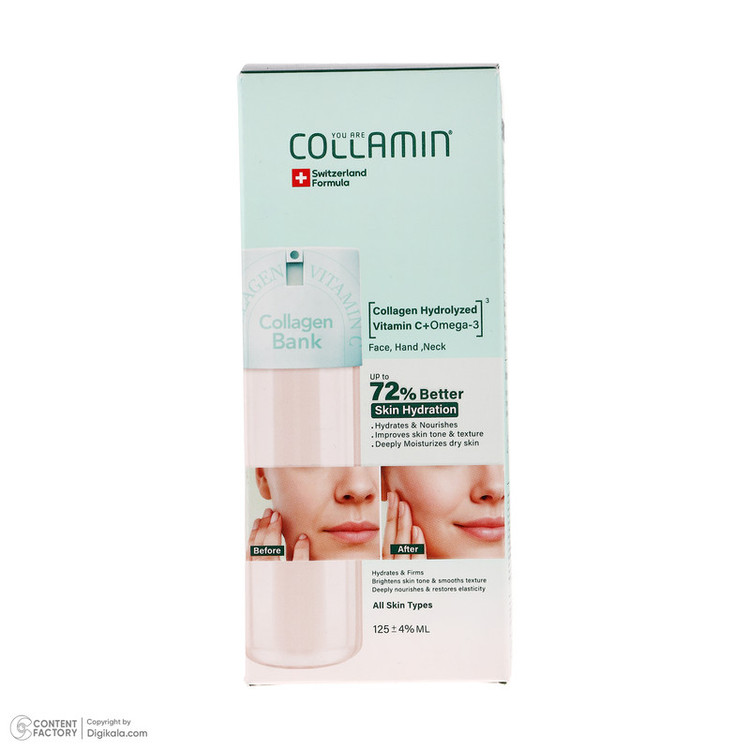 کرم مرطوبکننده صورت و گردن کلامین مدل Collagen Bank ترکیبی پیشرفته از کلاژن هیدرولیزشده، ویتامین C و امگا ۳ دارد که با هدف آبرسانی عمیق، تغذیه پوست و کمک به جوانسازی آن طراحی شده است. این کرم با نفوذ به لایههای سطحی پوست، رطوبت مورد نیاز را تأمین کرده و به بازسازی و تقویت بافت پوست کمک میکند تا ظاهری شادابتر و سالمتر ایجاد شود. استفاده مداوم از این محصول به کاهش نشانههای پیری کمک کرده و لطافت و شفافیت طبیعی پوست را تقویت میکند. کلاژن بانک کلامین با آبرسانی طولانیمدت، به حفظ رطوبت پوست تا ۲۴ ساعت کمک میکند و میتواند سطح آبرسانی پوست را بهطور چشمگیری افزایش دهد. این کرم در کاهش ظاهر چینوچروک و خطوط ظریف مؤثر است، به بهبود خطوط خنده کمک میکند و با افزایش خاصیت کشسانی، پوست را سفتتر و یکدستتر نشان میدهد. ترکیب کلاژن، ویتامین C و امگا ۳ مواد مغذی ضروری را در اختیار پوست قرار میدهد و برای انواع پوست، بهویژه پوست خشک و کمآب، مناسب است. فرمولاسیون این محصول با الهام از استانداردهای سوئیسی طراحی شده، فاقد پارابن است و تست حیوانی ندارد. کرم کلاژن بانک کلامین برای استفاده روی صورت، گردن و دست قابل استفاده است و حس طراوت و تازگی ملایمی روی پوست ایجاد میکند. با مصرف منظم، پوست عمیقاً آبرسانی و تغذیه میشود، بافت آن یکنواختتر و درخشندگی طبیعی آن بیشتر میشود و ظاهر جوانتر و سالمتری پیدا میکند.