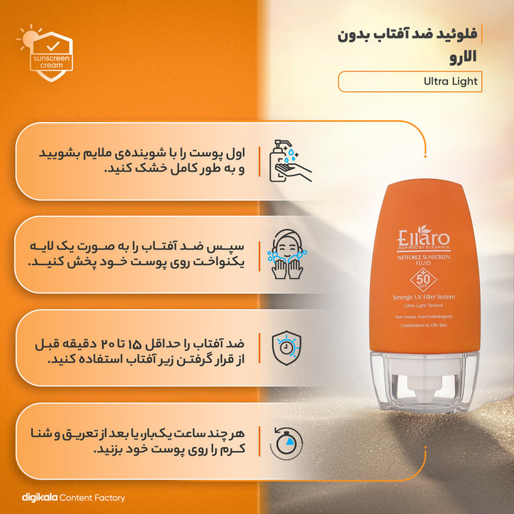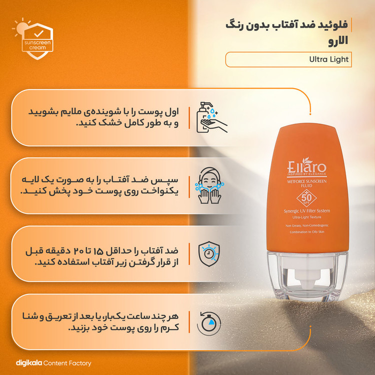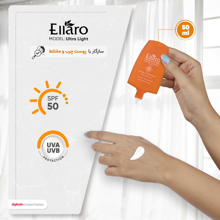 فلوئید ضدآفتاب بیرنگ الارو با SPF 50 و PA+++، یک انتخاب برجسته برای محافظت از پوست در برابر آفتاب است. این محصول با بافت سبک و بدون رنگ خود، برای انواع پوستها مناسب بوده و به راحتی جذب میشود. ویژگیهای حفاظتی این فلوئید در برابر اشعههای UVA و UVB، از پوست در برابر آسیبهای ناشی از نور خورشید محافظت میکند. ترکیبات فاقد چربی این محصول، از ایجاد جوش و کومدون جلوگیری میکند و برای پوستهای چرب و مختلط بسیار مناسب است. فلوئید الارو دارای خواص ضد جوش و آکنه، ضد چروک و روشن کننده است که به حفظ جوانی و شادابی پوست کمک میکند. این فلوئید ضد حساسیت بوده و از بروز التهاب و قرمزی در پوست جلوگیری میکند. بافت سبک و جذب سریع این فلوئید، احساس راحتی و تازگی به پوست میدهد و بدون ایجاد حس چسبندگی یا سنگینی، میتواند به عنوان یک پایه آرایشی نیز استفاده شود.