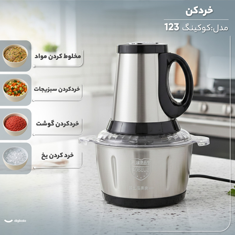 خردکن کوکینگ دارای موتور قوی و تیغه های تیز است،مناسب برای خرد کردن مواد غذایی مختلف به ویژه سبزیجات و پیاز و ناگت و گوشت و…است.ظرفیت ظرف ۳ لیتر میباشد اندازه مناسبی برای استفاده یک خانواده میباشد.جنس بدنه استیل ضد زنگ و مقاوم در برابر ضربات فیزیکی می باشد.خردکن موفق برند کوکینگ 1200وات با داشتن توان قدرتی 1200 وات یکی از قدرتمندترین خردکن های حال حاضر دنیا می باشد.این دستگاه دارای دو تیغه ۴ پره بسیار تیز می باشد و جنس تیغه ها استیل ضدزنگ میباشد.دارای کارایی بسیار بالا میباشد.