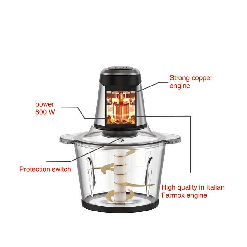 دارای یک موتور پر قدرت 600 وات مسی کامل است ، و کلید حفاظتی دارد که فقط در هنگام قرار گرفتن بر روی وسیله امکان روشن شدن موتور را فراهم میکند ، در طراحی این وسیله راحتی استفاده و روزمره بودن ان بسیار مورد توجه بوده است ، امروزه با وجود تعداد زیادی از لوازم کمک اشپزی در بازار ، بسیاری از کاربرها هنوز از دست و روشهای سنتی استفاده میکنند ، و دلیل ان هم سخت بودن استفاده از لوازم جدید میباشد ، در طراحی غذا ساز و خردکن فارموکس سعی بر ان شده که کاربرد این وسیله تا جای امکان اسان باشد ، و بتوان هر روز ان را در اشپزخانه استفاده کرد ، و شستن و تمیز کردن ان هم بسیار اسان باشد .